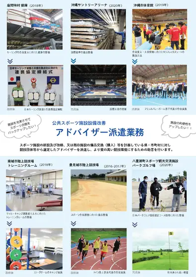 スポーツ施設の新設及び改修、又は既存施設の備品交換(購入)等を計画している市町村等に対し、より質の高い競技環境にする為の助言を行うアドバイザーを派遣します。